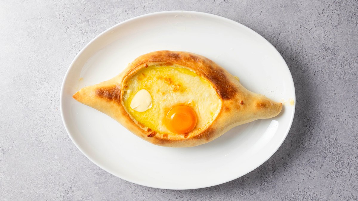 georgisches Schifferbrot gefüllt mit einer herzhaften Käsemischung, Ei und einem Stück Butter