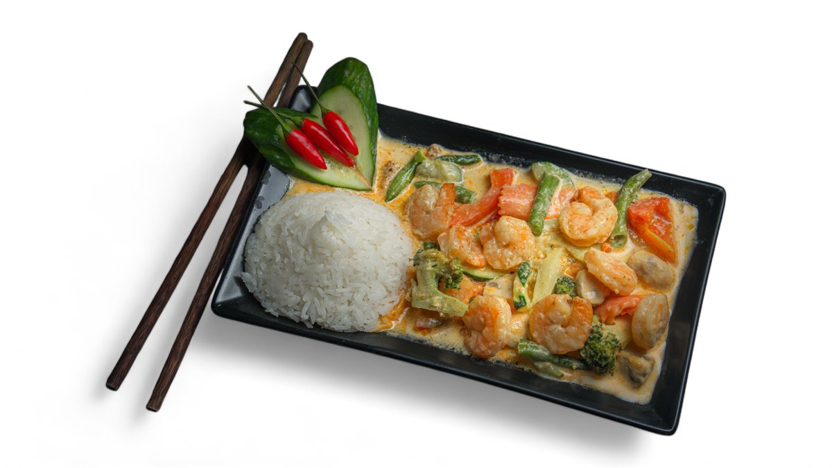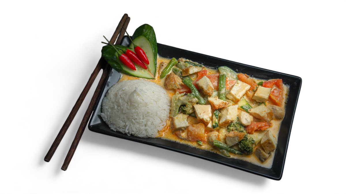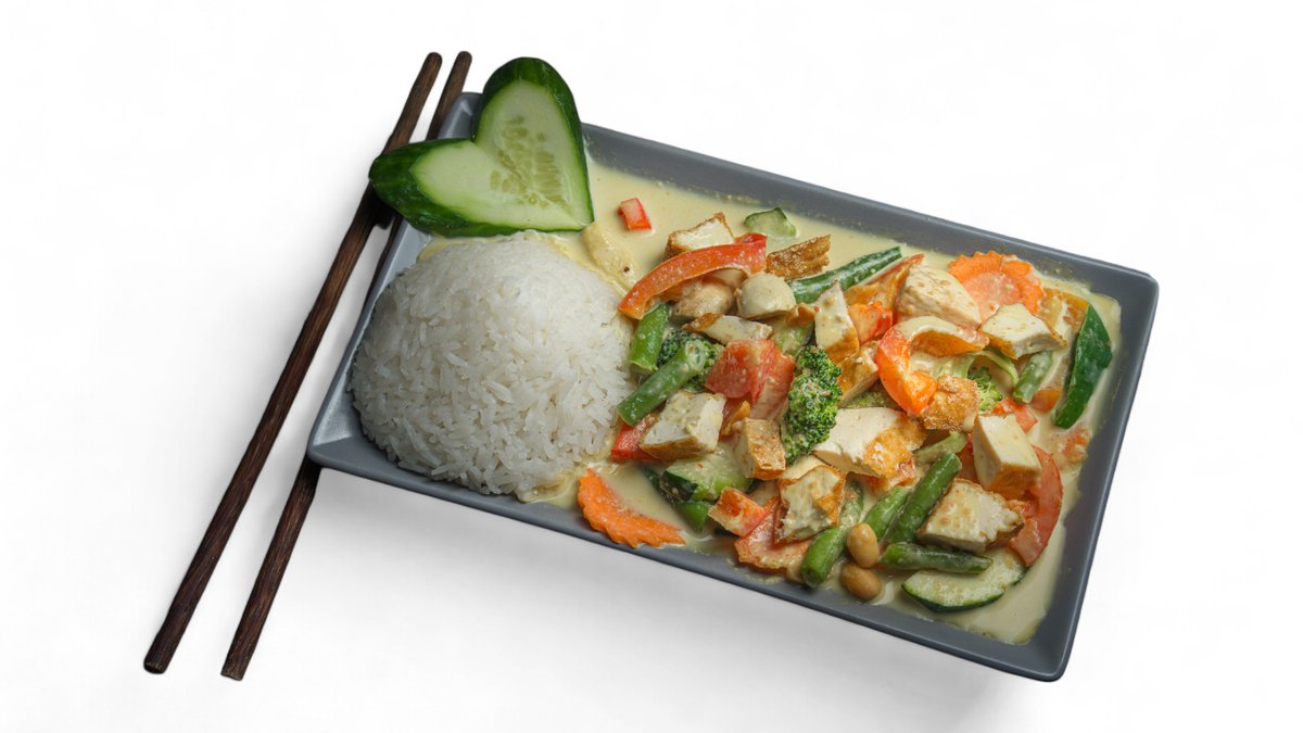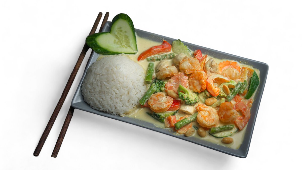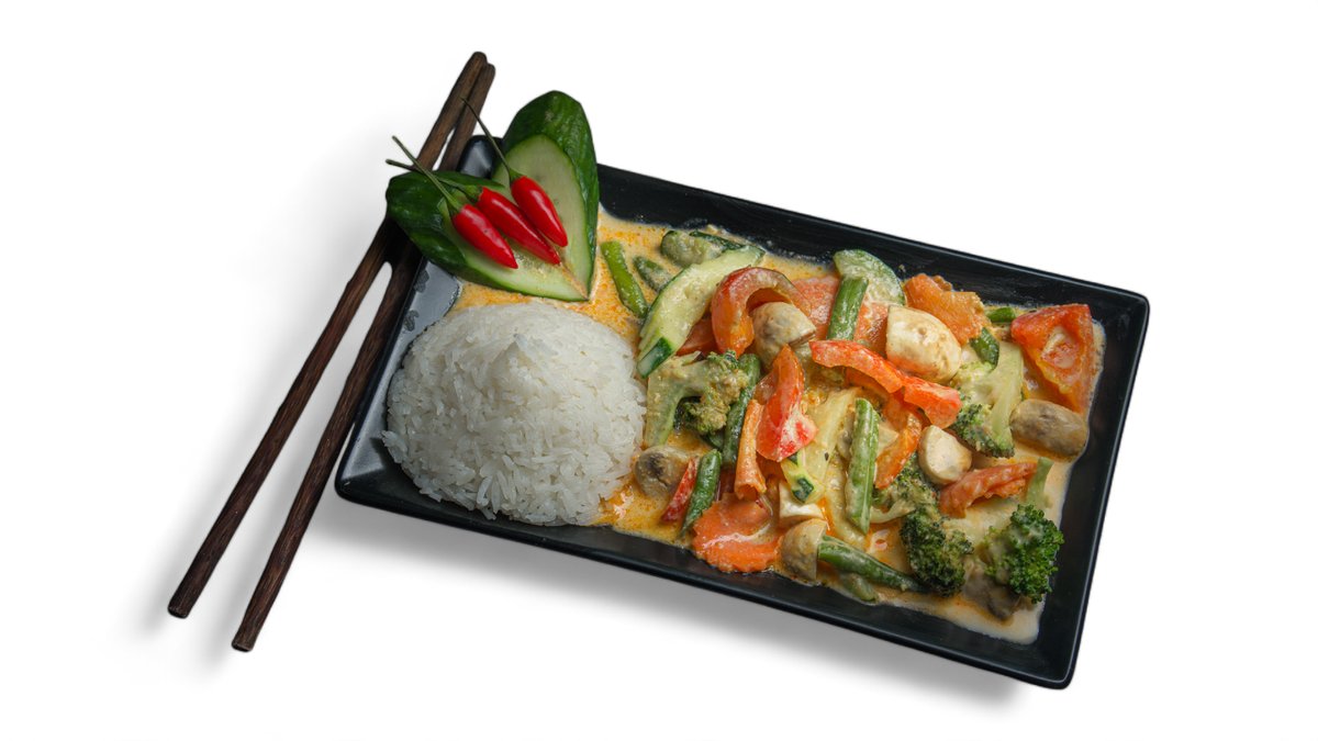 mit Kokosnussmilch, Champignons, Brokkoli, Paprika, Möhren, Sprossen, Bambus, Glasnudeln und Koriander