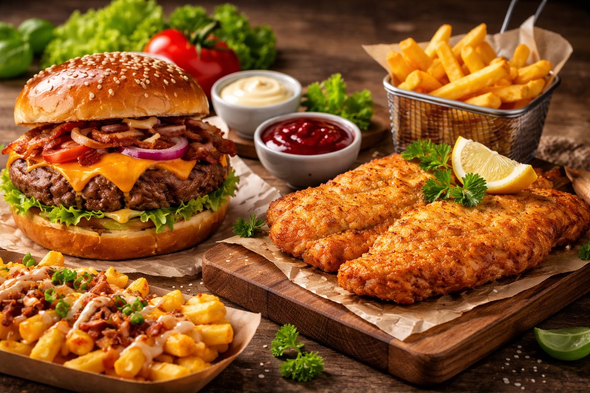 alle Burger werden mit Pommes frites serviert