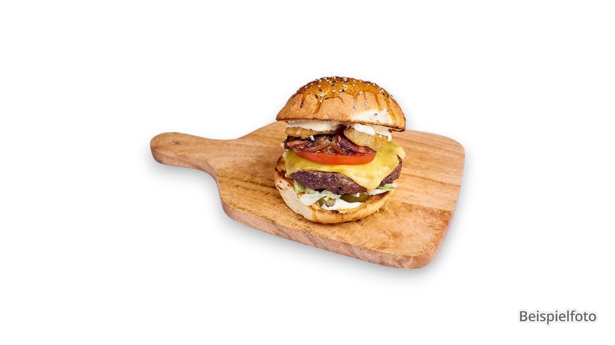180 g Rindfleisch Patty, Salat, Honig Barbecuesoße, Bacon, Käse, karamellisierte Zwiebeln und ein Spiegelei