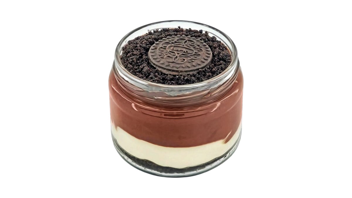 Kuchen im Glas unsere Neuheit: cremiger Oreo-Schokoladengeschmack mit feiner Creme. Schicht für Schicht ein echter Genuss.