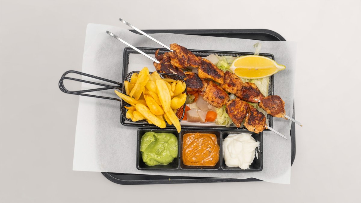mit Hähnchenfleisch vom Spieß und Pommes frites