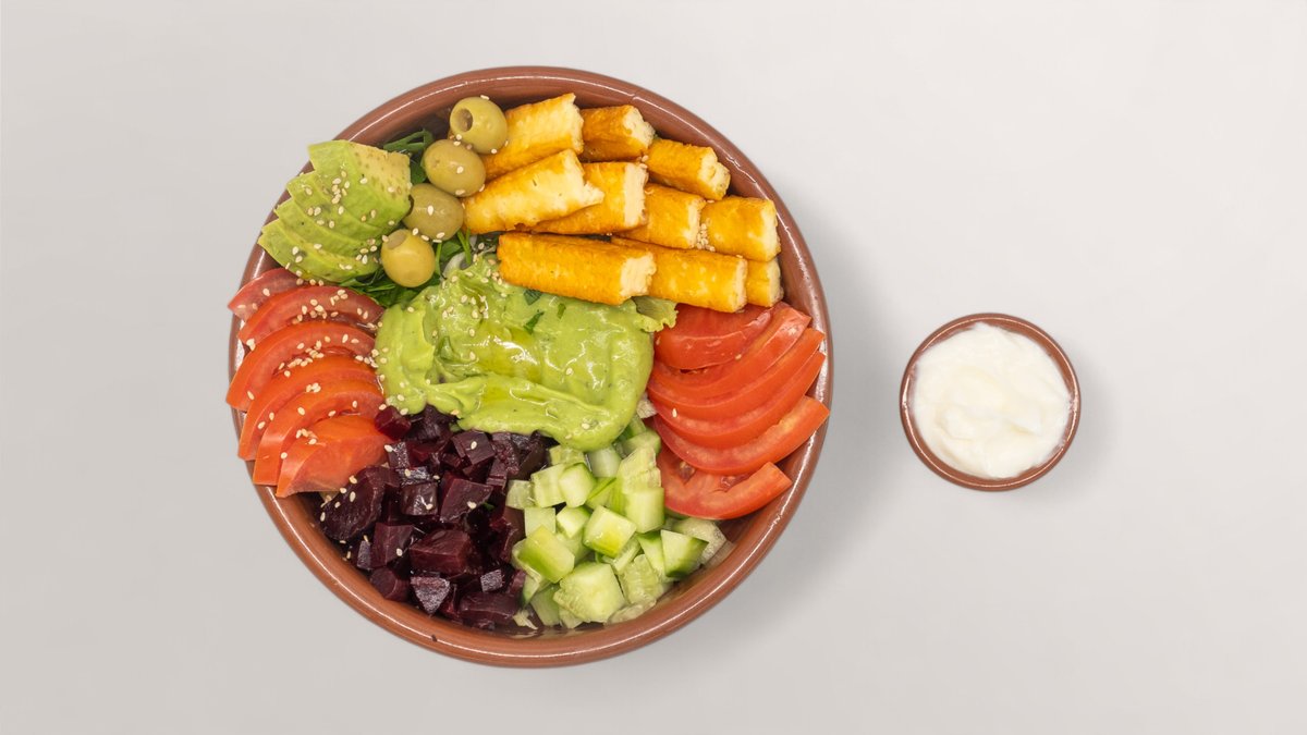 Halloumi, Aubergine, Kräutertomaten, Salat, Avocado, Rote Bete, Soße