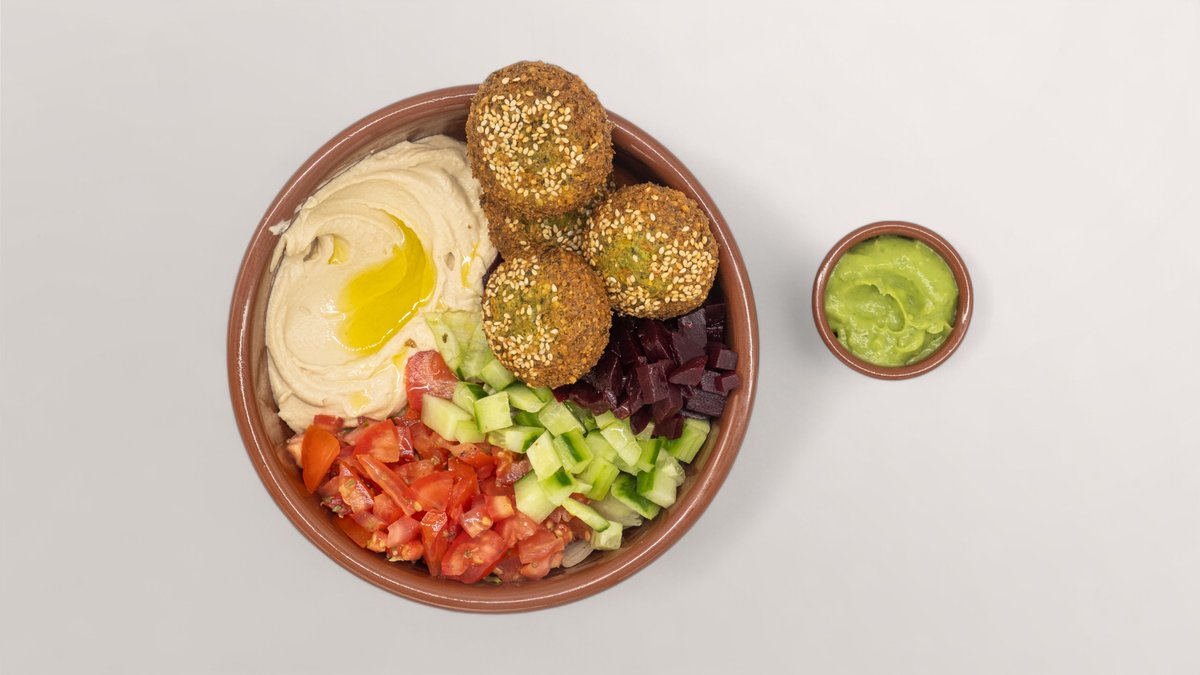 Falafel, Hummus, Kräutertomaten, Salat, Avocado, Rote Bete, Soße