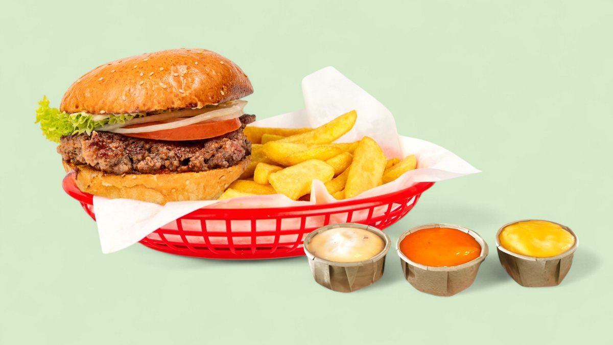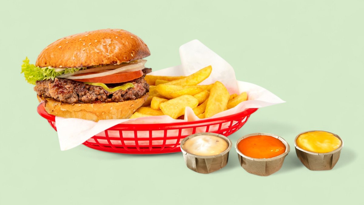 mit doppeltem Hamburger, Pommes frites und 2 Soßen deiner Wahl