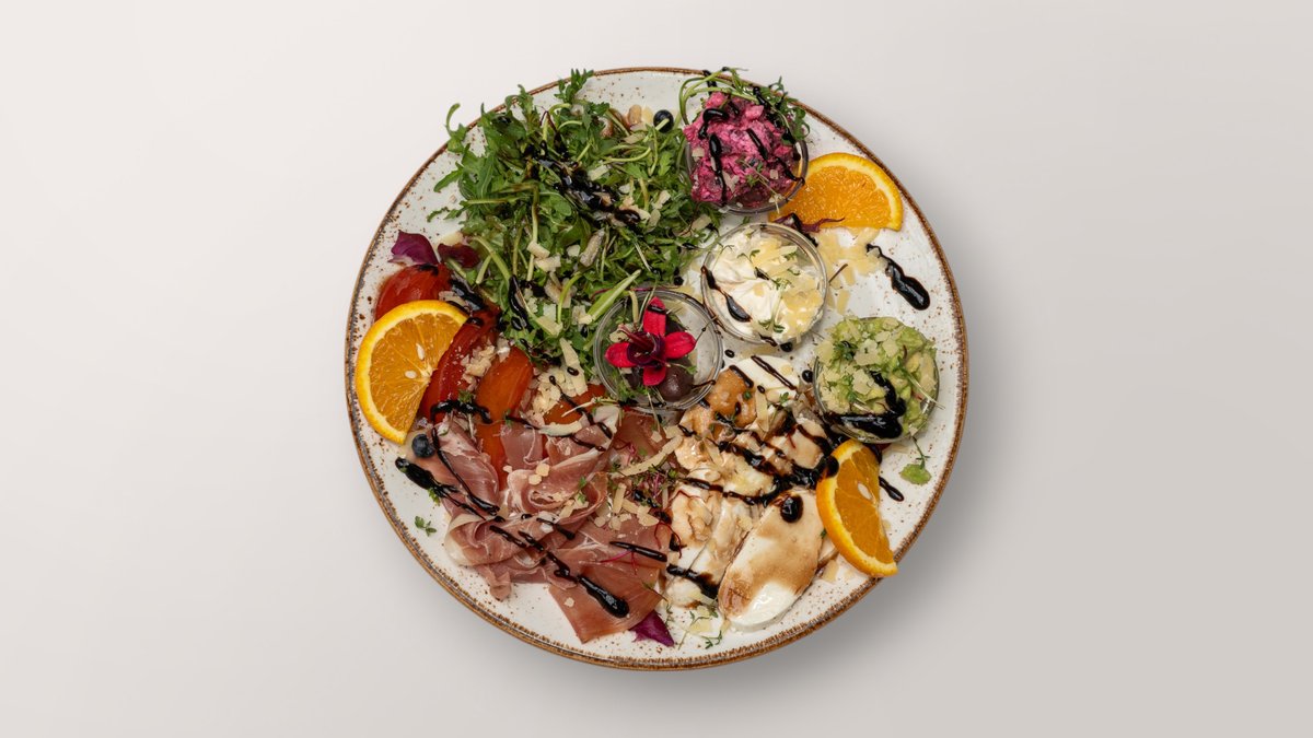 mit Parmaschinken, Parmesan, Rucola, Mozzarella, Tomaten, Brot und frisch gepressten Orangensaft