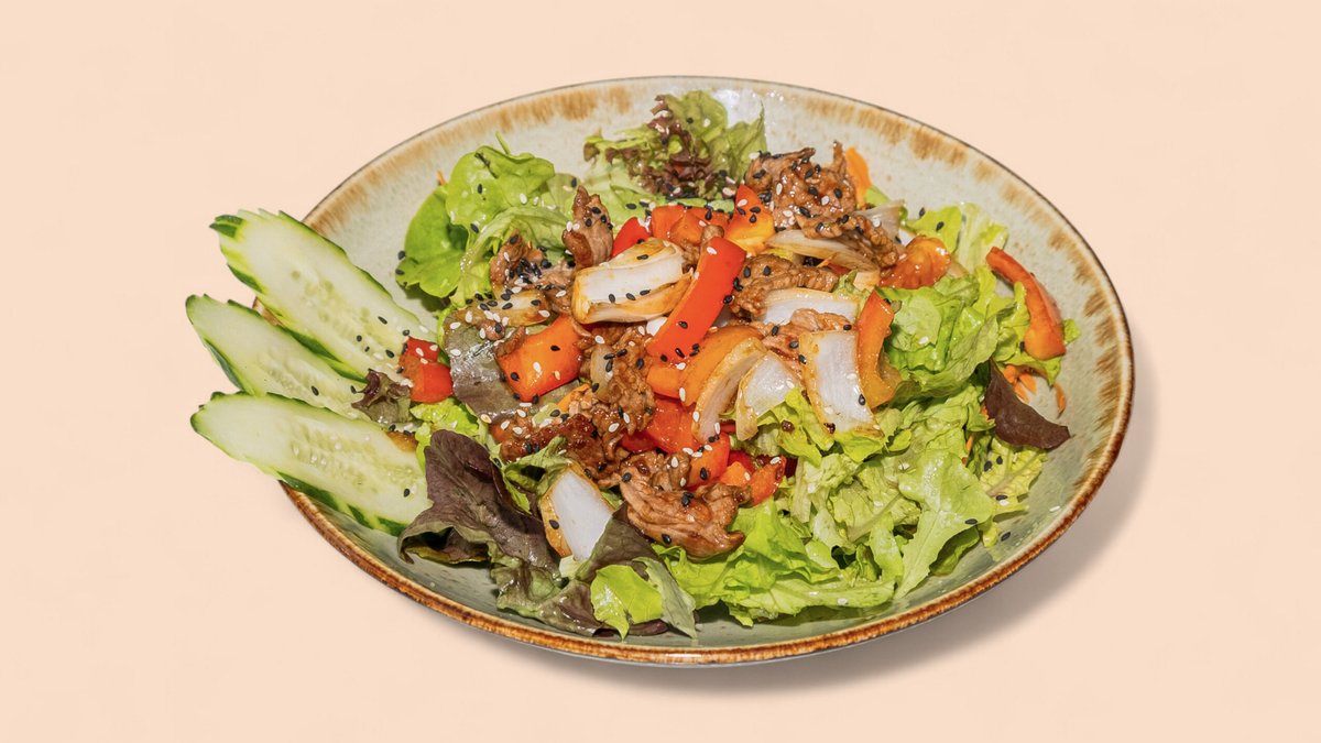 im Feuer gebratene Rinderfiletstreifen mit saisonalem Salat, dazu hausgemachtes, leicht scharfes Dressing