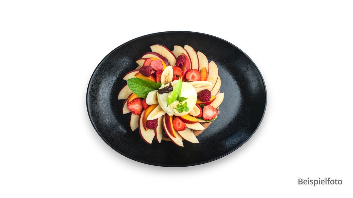 mit Vanilleeis, Sahne, Kiwi, Bananen, Erdbeeren und Soßen