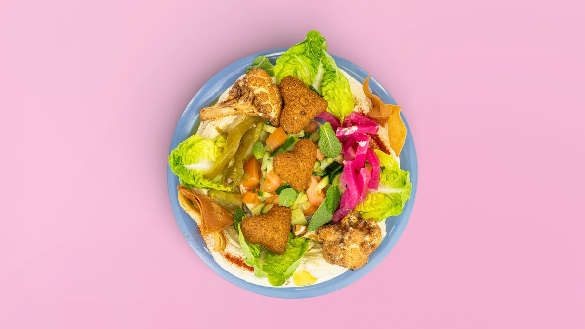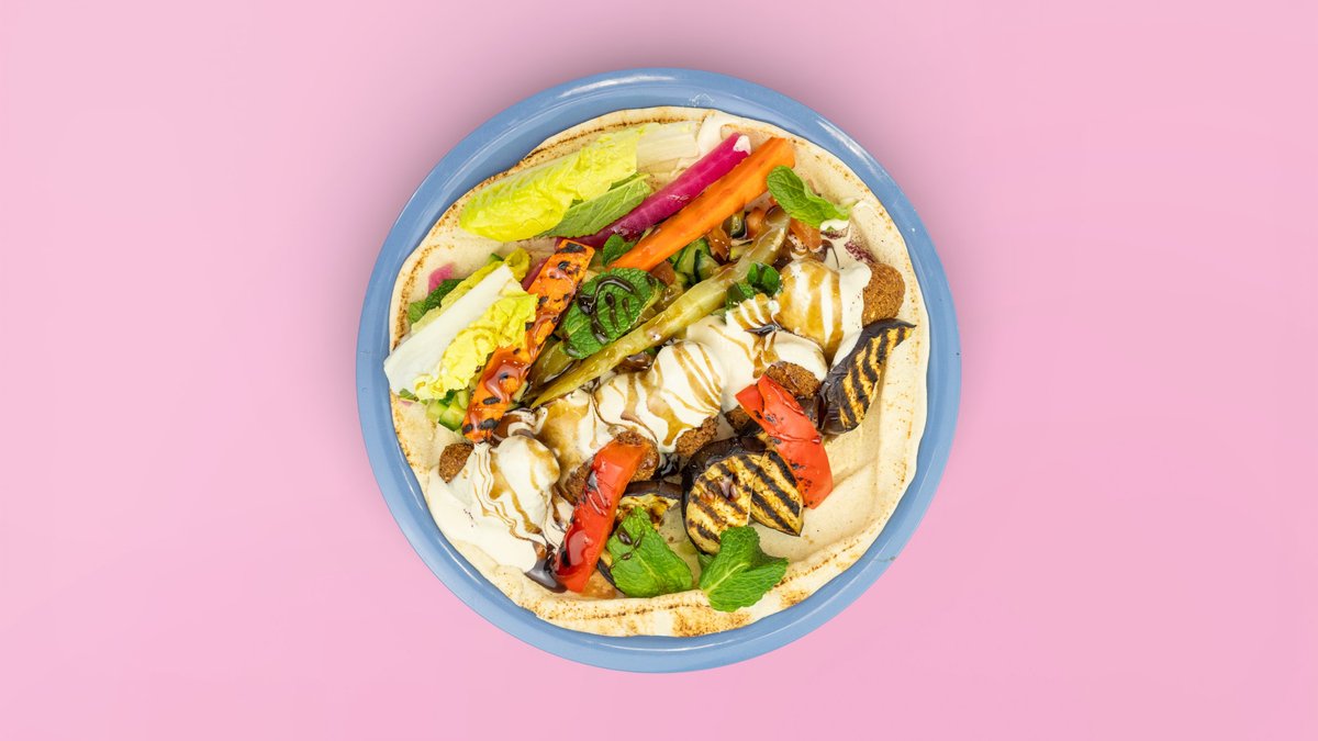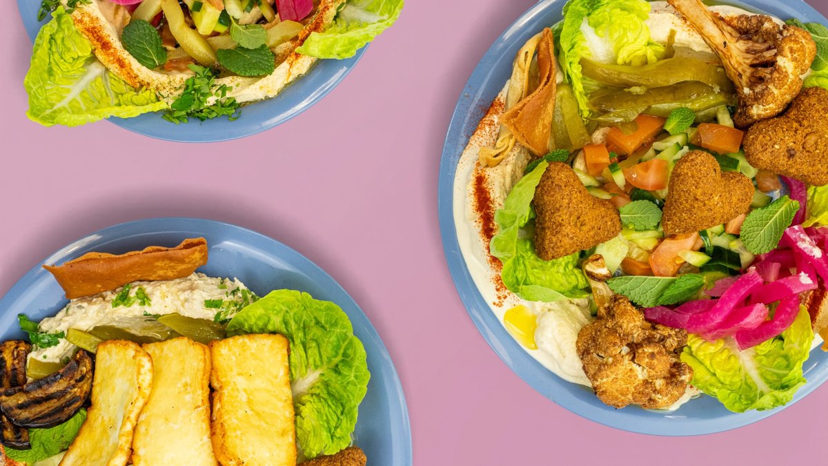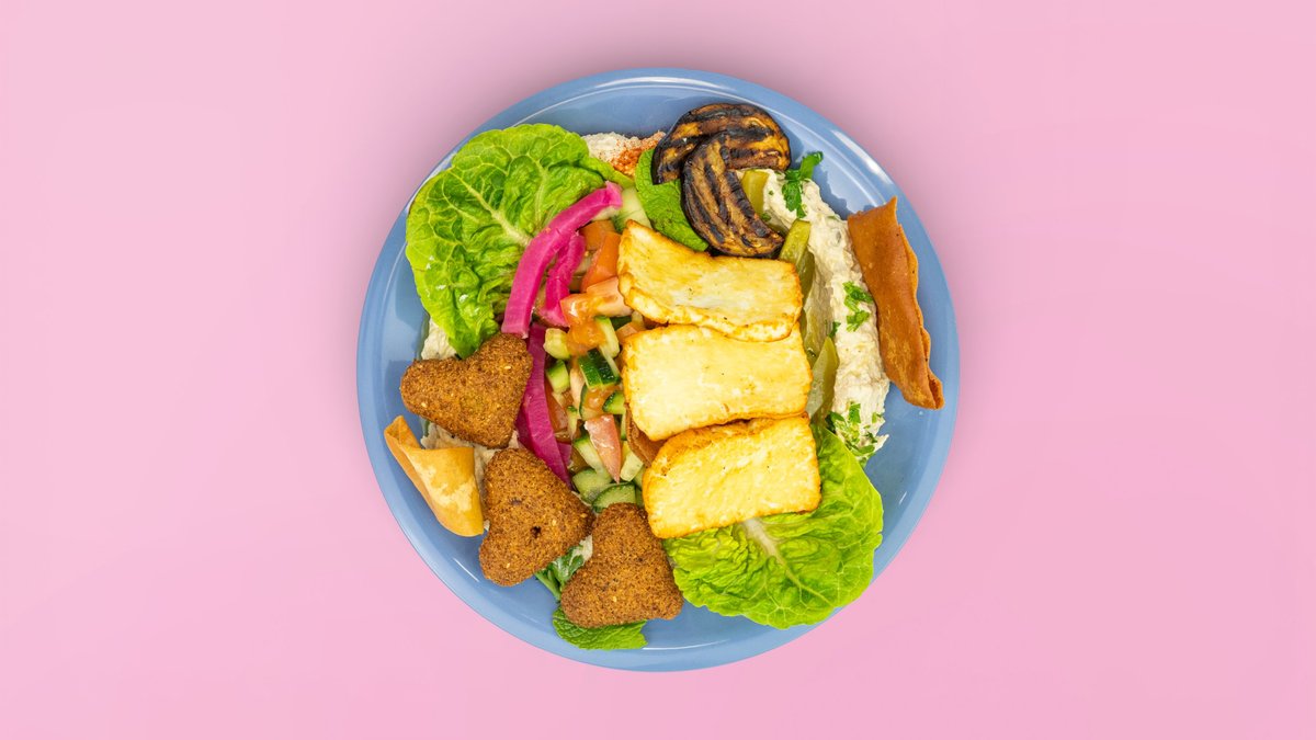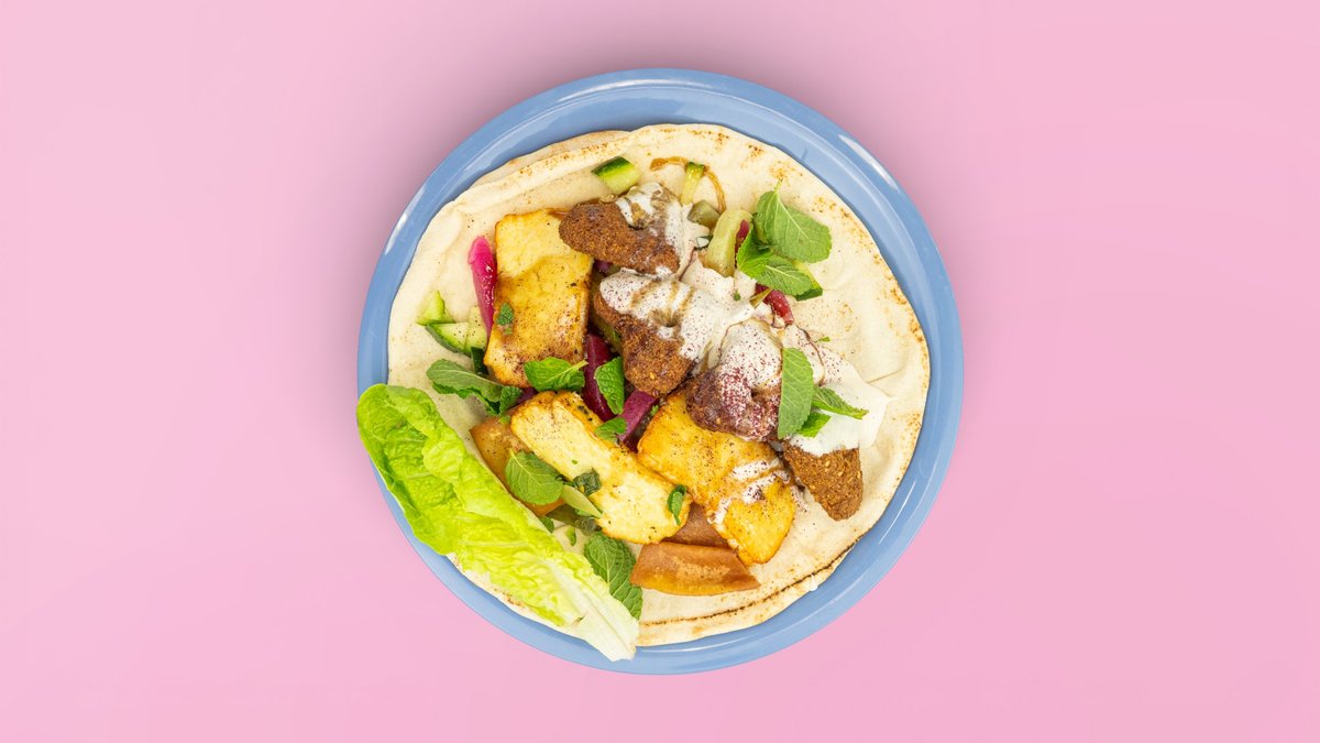 mit cremigem Minze-Zitronen-Hummus, Halloumi, Tomate, Gurken, eingelegten Gurken, roten Rüben, knackigem Romana-Salat, Minze, Granatapfelmelasse, und Sumak