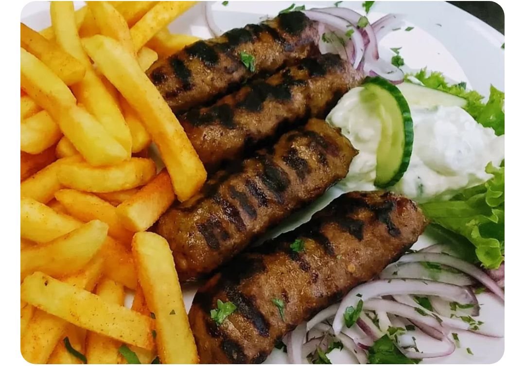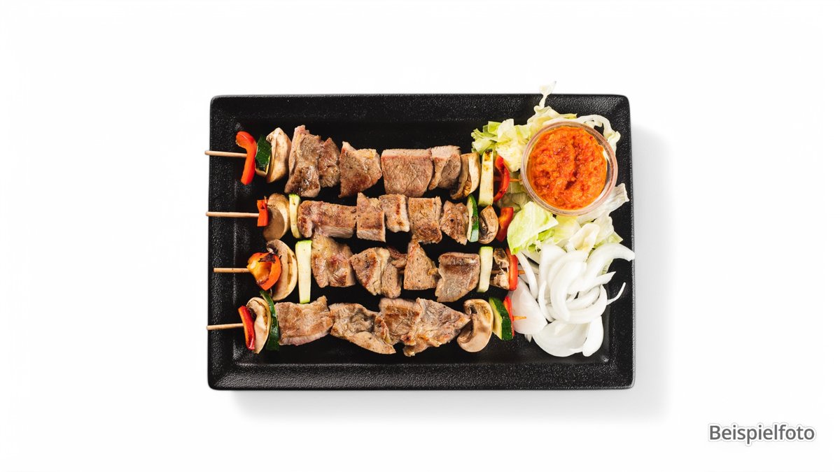 4× Souvlakia vom Schwein 4× Soutzoukakia vom Schwein 2x Bifteki Schwein 1x Gyrosfleisch vom Schwein mit Pommes frites, Tsatsiki und Krautsalat