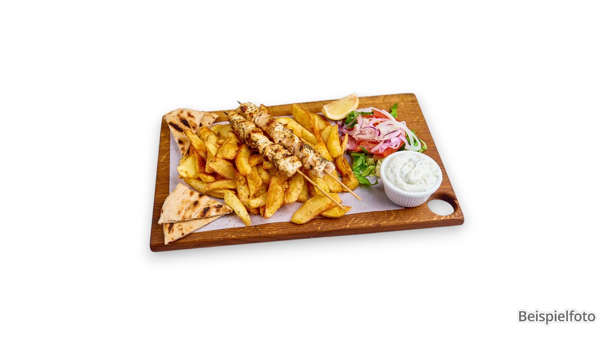 2 Spieße vom Hähnchen mit Pommes frites, Tsatsiki und Krautsalat