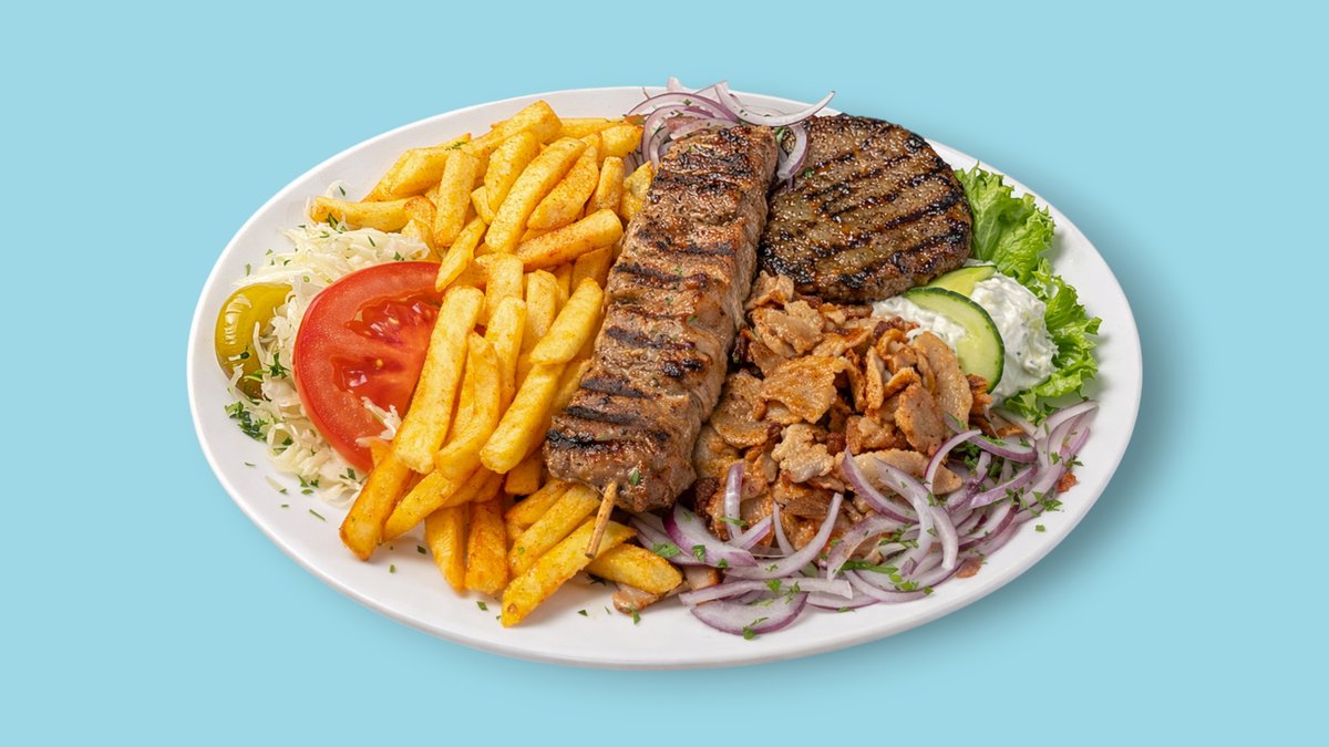 2x Souvlaki vom Schwein 2x Soutzoukakia vom Schwein 1× Bifteki vom Schwein 1x Gyros vom Schwein mit Pommes frites, Tsatsiki und Krautsalat