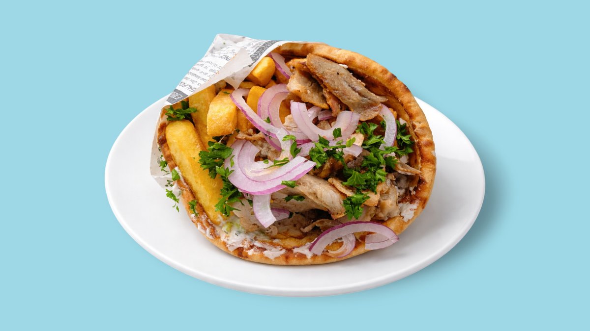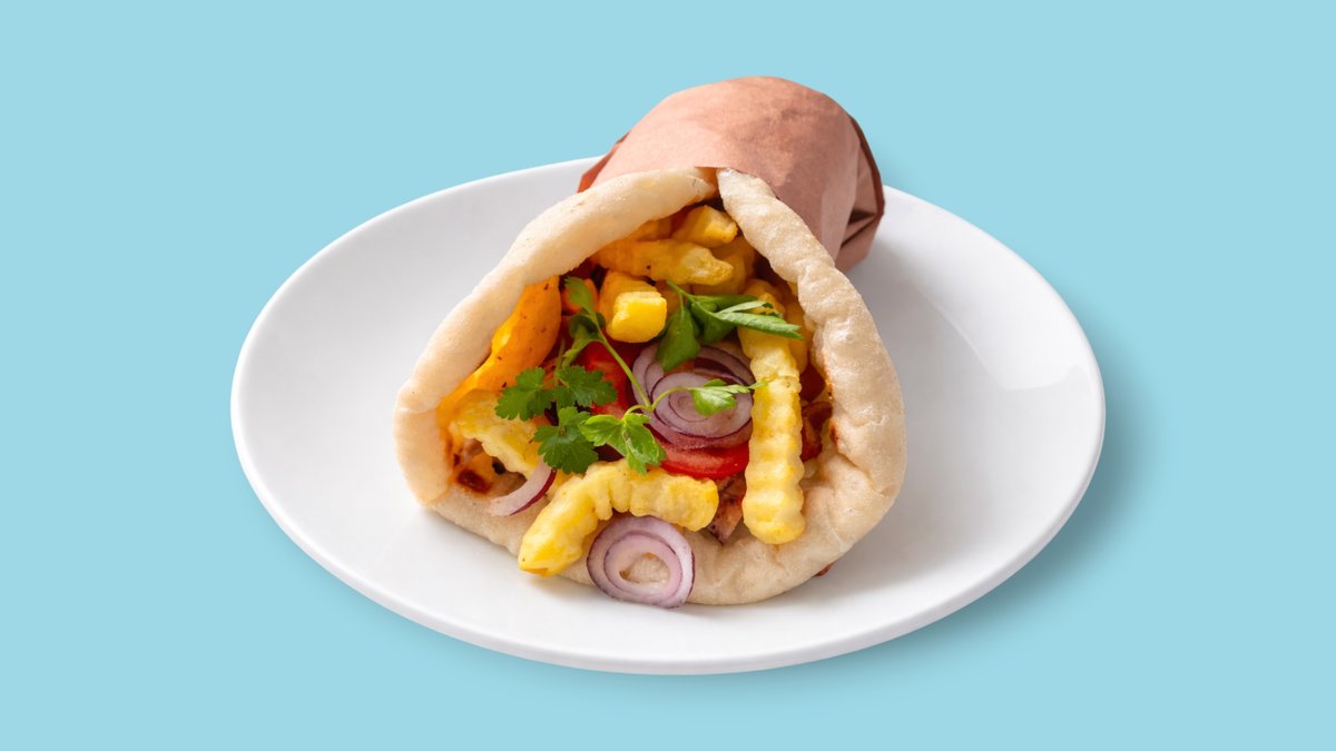 mit Tomaten, Zwiebeln, Pommes frites und Tsatsiki im Pitabrot gerollt