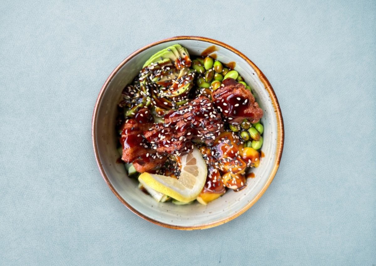 mit frittierter Garnele, Avocado, Mango, Chili-Mayonnaise, Sesam, Tenkatsu Flocken und Röstzwiebeln
