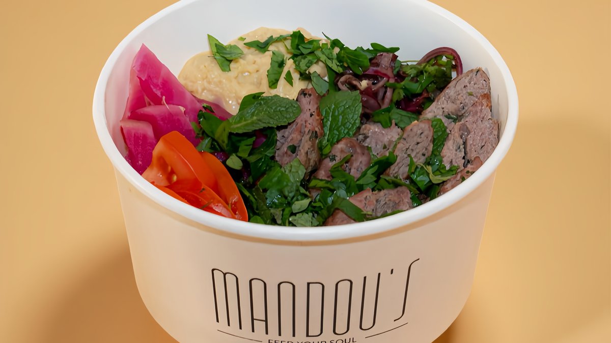 Frisch gegrillte Hähnchenspieße, Kafta-Spieße oder knusprige Falafel treffen auf die Gewürzvielfalt der Levante, Kräuter, Pickles, frisches Gemüse und aromatische Saucen – eingerollt im Fladenbrot. Mandou's Signature Rolls.