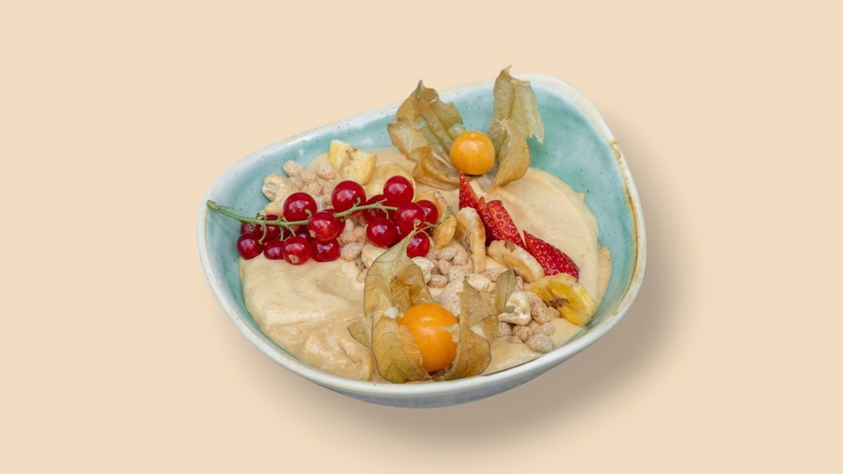 mit Erdnussbutter, Banane, Mango, Himbeermarmelade, Granola und Obst der Saison