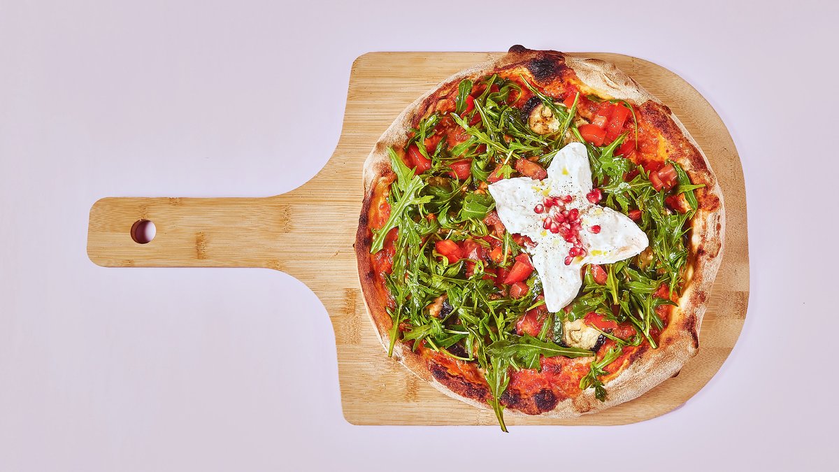 mit Tomatensoße, Fior di Latte, gegrillten Auberginen, Rucola, frischen Tomaten, Burrata und Himalaya-Salz