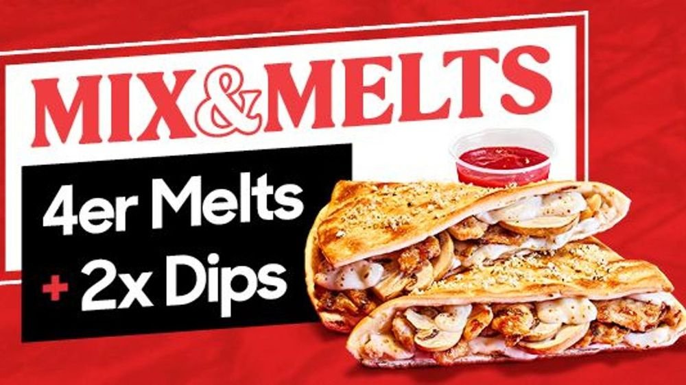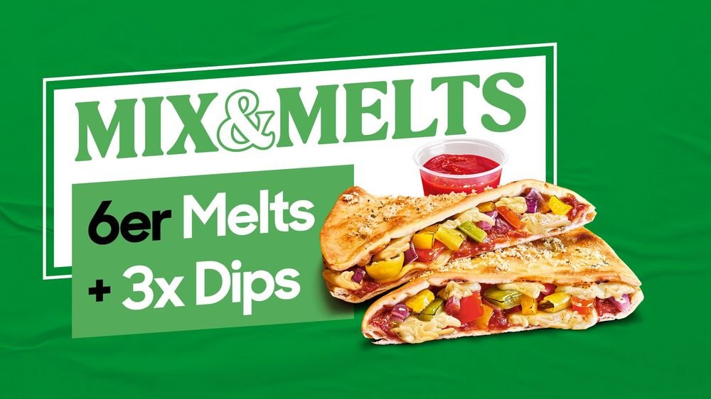 Mix&Melts: 6x Melts mit 3x Dips: Mix&Melts and wähle deine Lieblings-Melts aus. MELTS Vegan Chik'n'Salsa: Thin‘N’Crispy, Violife Vegane Käsealternative, Plant Deli Vegane H*hnchenstreifen, Champignons, Tomatensauce, Knoblauchöl, Violife Vegane Hartkäsealternative, Oregano DIP: Chilisauce MELTS Spicy Vegan: Thin‘N’Crispy, Violife Vegane Käsealternative, rote Zwiebeln, Pfefferschoten, Paprika-Mix, Tomatensauce, Knoblauchöl, Violife Vegane Hartkäsealternative, Oregano DIP: Chilisauce