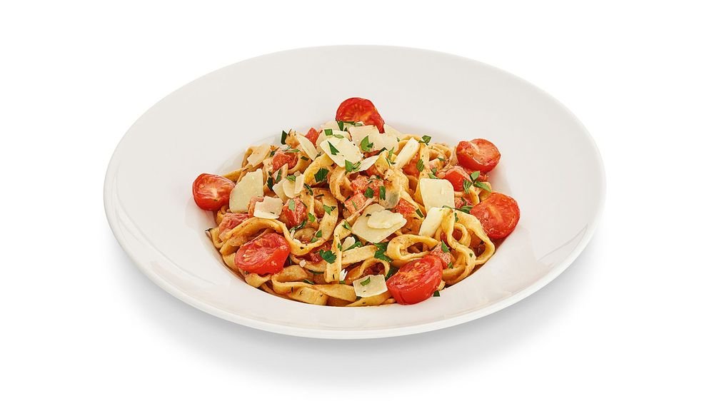 Tagliatelle, Cherrytomaten, Bruschetta-Mix, Parmesan, Tomatensauce, Käsesauce, Petersilie