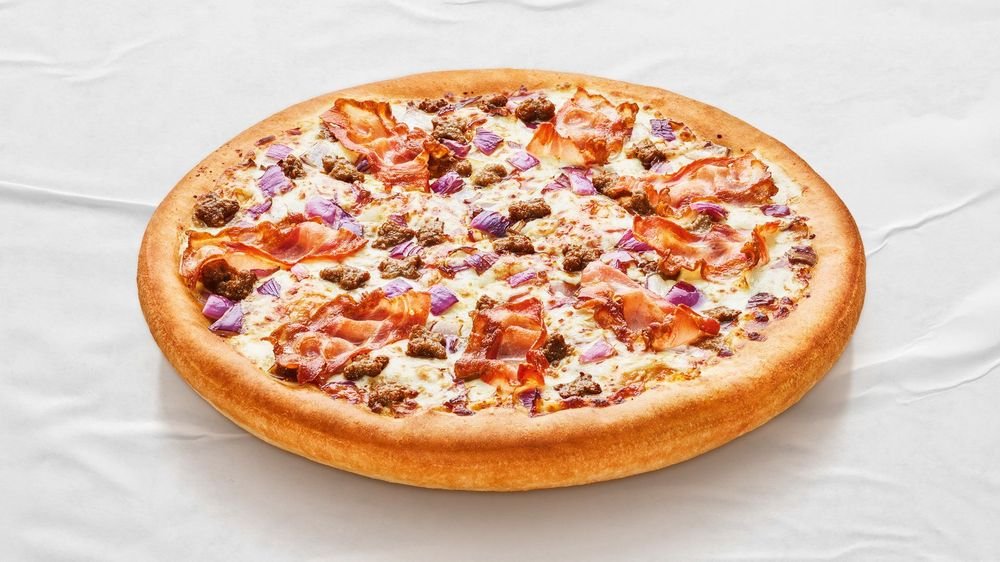Teig, Tomatensauce, Mozzarella, Bacon, Rinderhack, Schinken, Salami