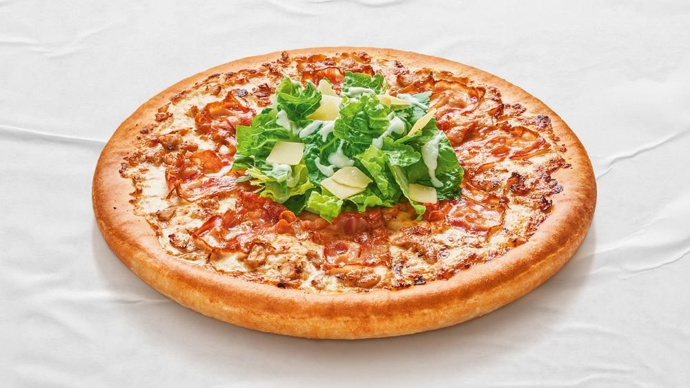 Teig, Bacon, mariniertes, gegrilltes Hähnchenfleisch, Romanasalat, Parmesan, Mozzarella, Caesarsauce
