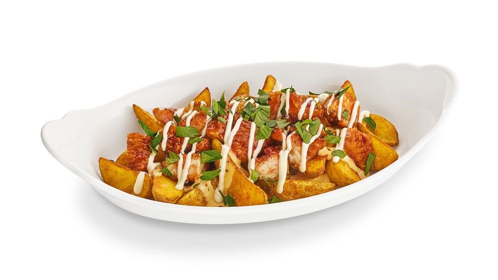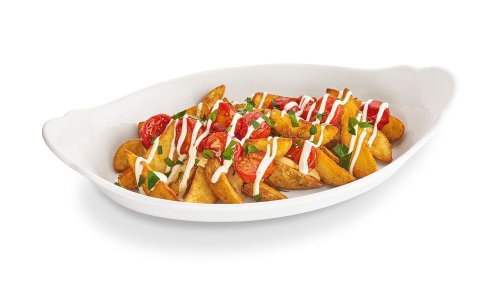 Kartoffelspalten, Romanasalat, Cherrytomaten, Bruschetta-Mix, Hirtenkäse, rote Zwiebeln, Caesar-Dressing, Petersilie