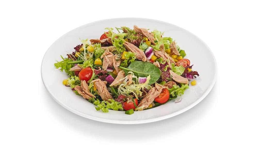 Eisberg Salat, Radicchio Salat, Cherrytomaten, Mais, BettaF!sh TU-NAH Vegane Thunfisch-Alternative, rote Zwiebeln, Paprika-Mix, Balsamico-Dressing
