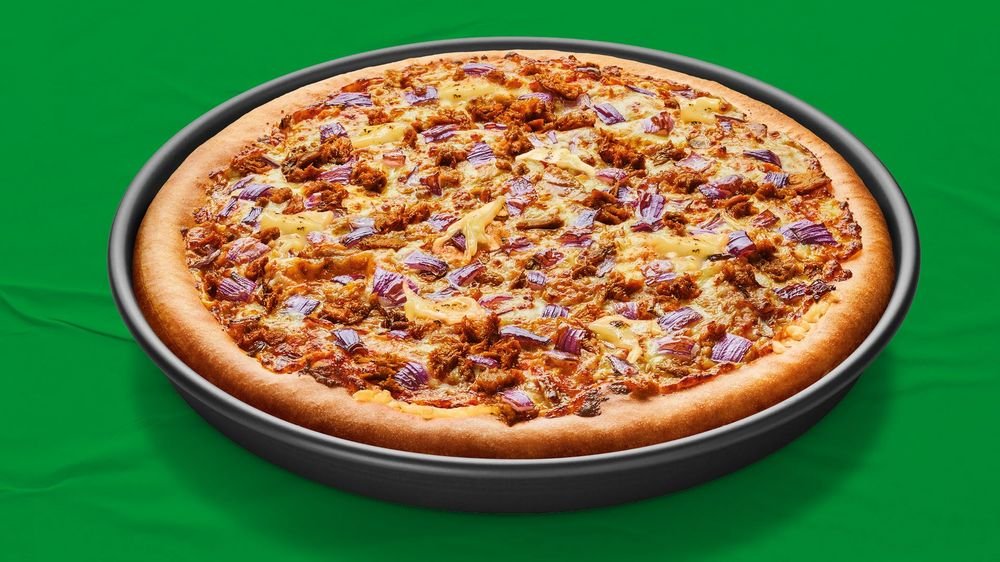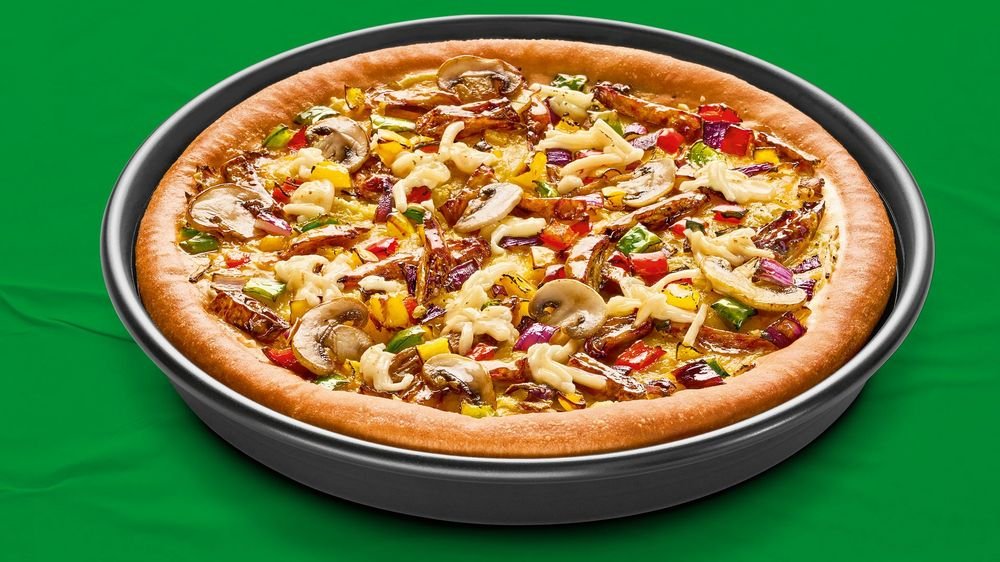 Thin‘N’Crispy, Violife Vegane Käsealternative, Plant Deli Vegane H*hnchenstreifen, Champignons, Tomatensauce, Knoblauchöl, Violife Vegane Hartkäsealternative, Oregano DIP: Chilisauce