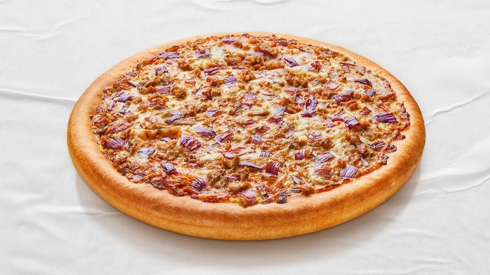 Teig, Barbecuesauce, Mozzarella, Bacon, Rinderhack, rote Zwiebeln