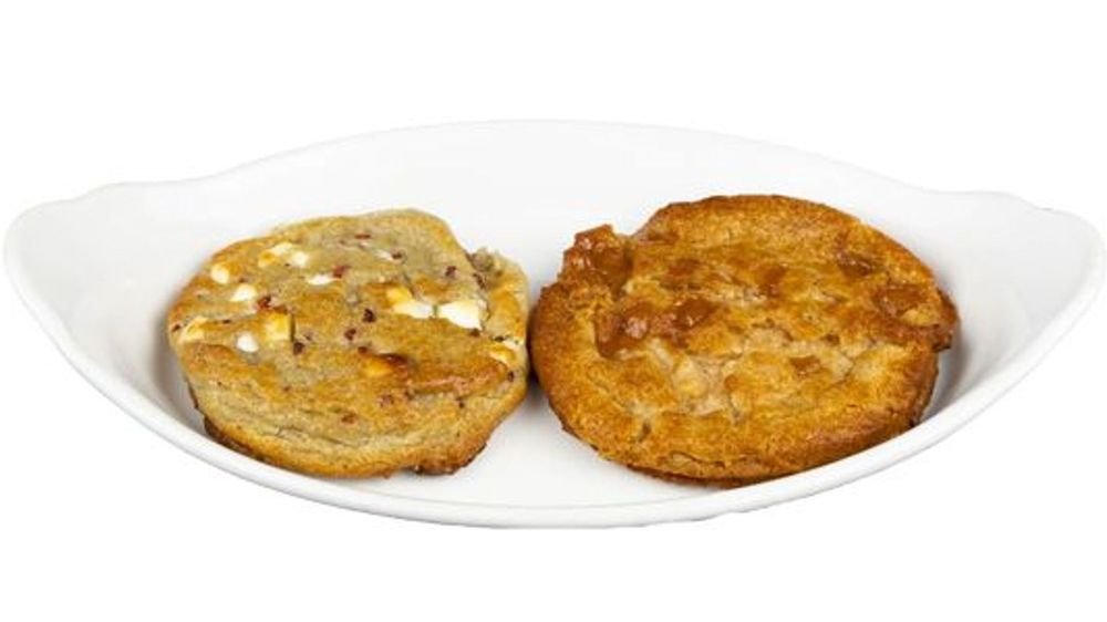 Frisch gebackener Keksteig mit weißen Schokostückchen und Himbeeren