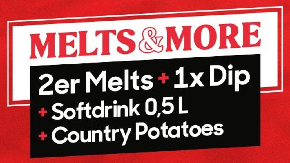Melts & More: Wähle 2er Melts aus Vegan Chik'n'Salsa oder Spicy Vegan mit 1 x Dip, 0,5 L Softdrink und Country Potatoes MELTS Vegan Chik'n'Salsa: Thin‘N’Crispy, Violife Vegane Käsealternative, Plant Deli Vegane H*hnchenstreifen, Champignons, Tomatensauce, Knoblauchöl, Violife Vegane Hartkäsealternative, Oregano DIP: Chilisauce MELTS Spicy Vegan: Thin‘N’Crispy, Violife Vegane Käsealternative, rote Zwiebeln, Pfefferschoten, Paprika-Mix, Tomatensauce, Knoblauchöl, Violife Vegane Hartkäsealternative, Oregano DIP: Chilisauce