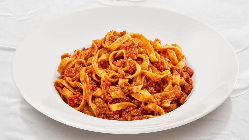 Teig, Rindfleischbolognese, Bruschetta-Mix, Parmesan, Mozzarella