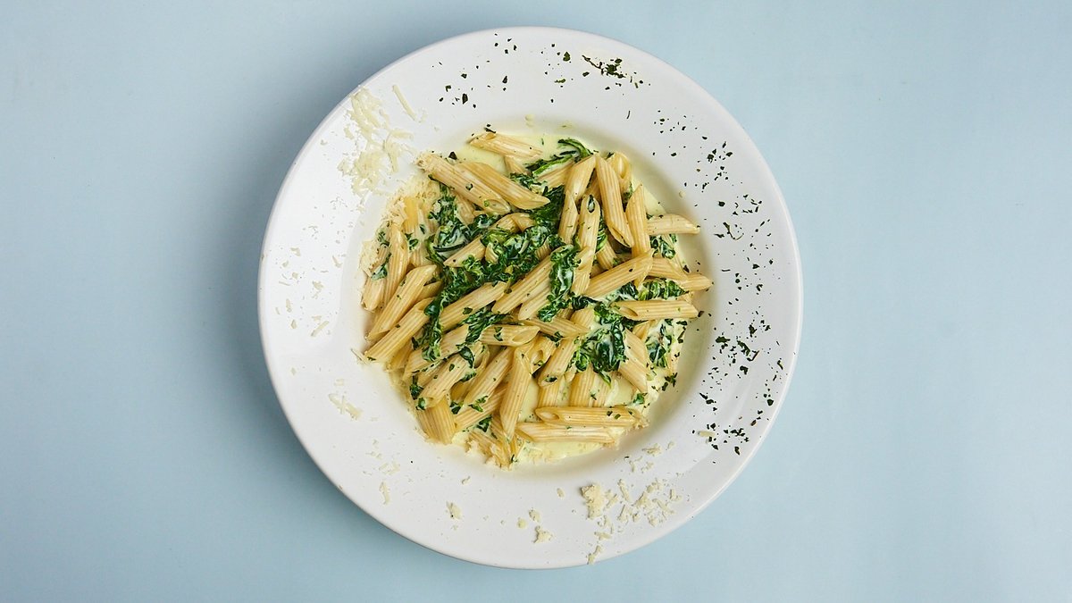 mit Spinat, Erbsen, Knoblauch und Rahmsoße