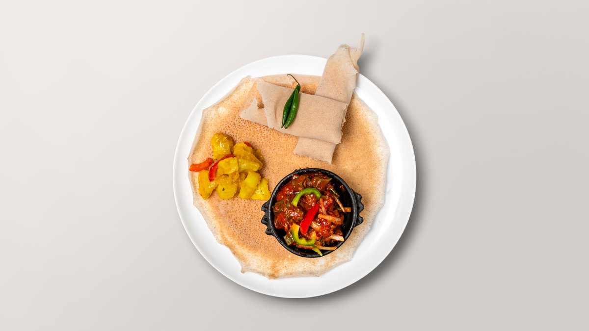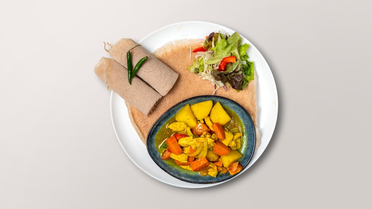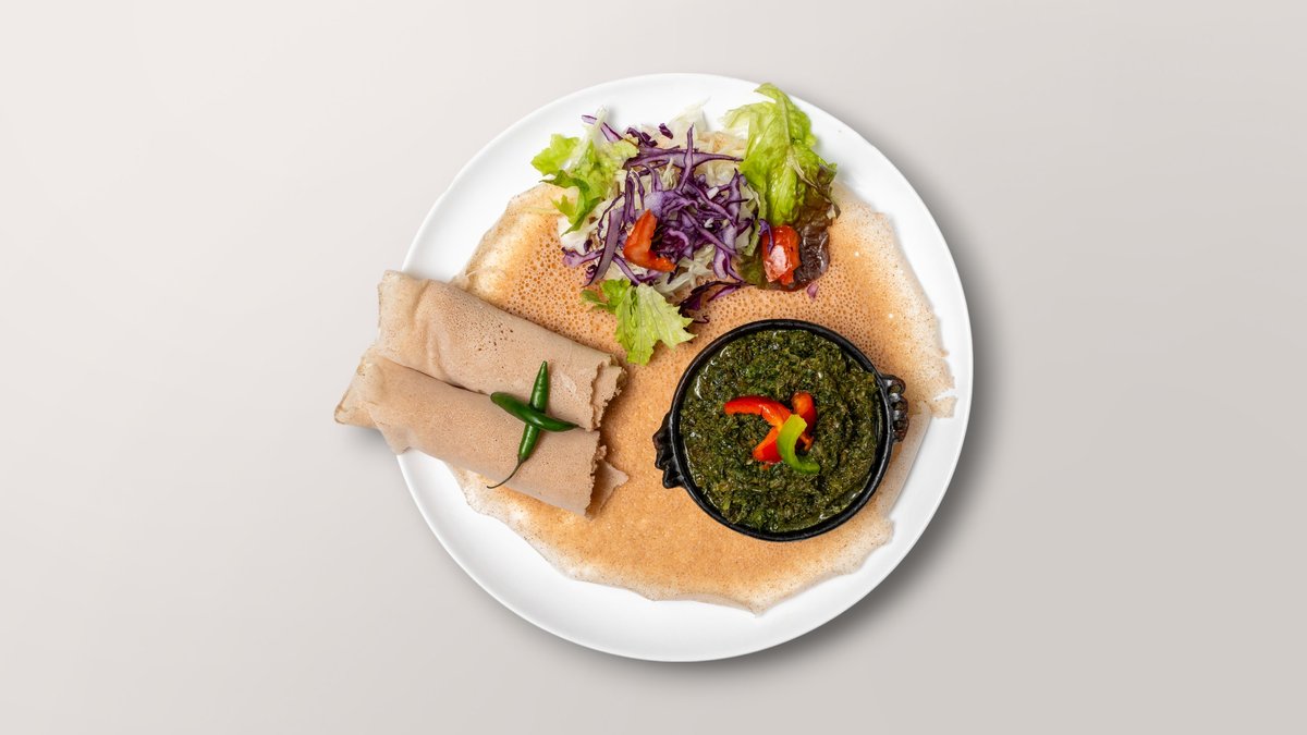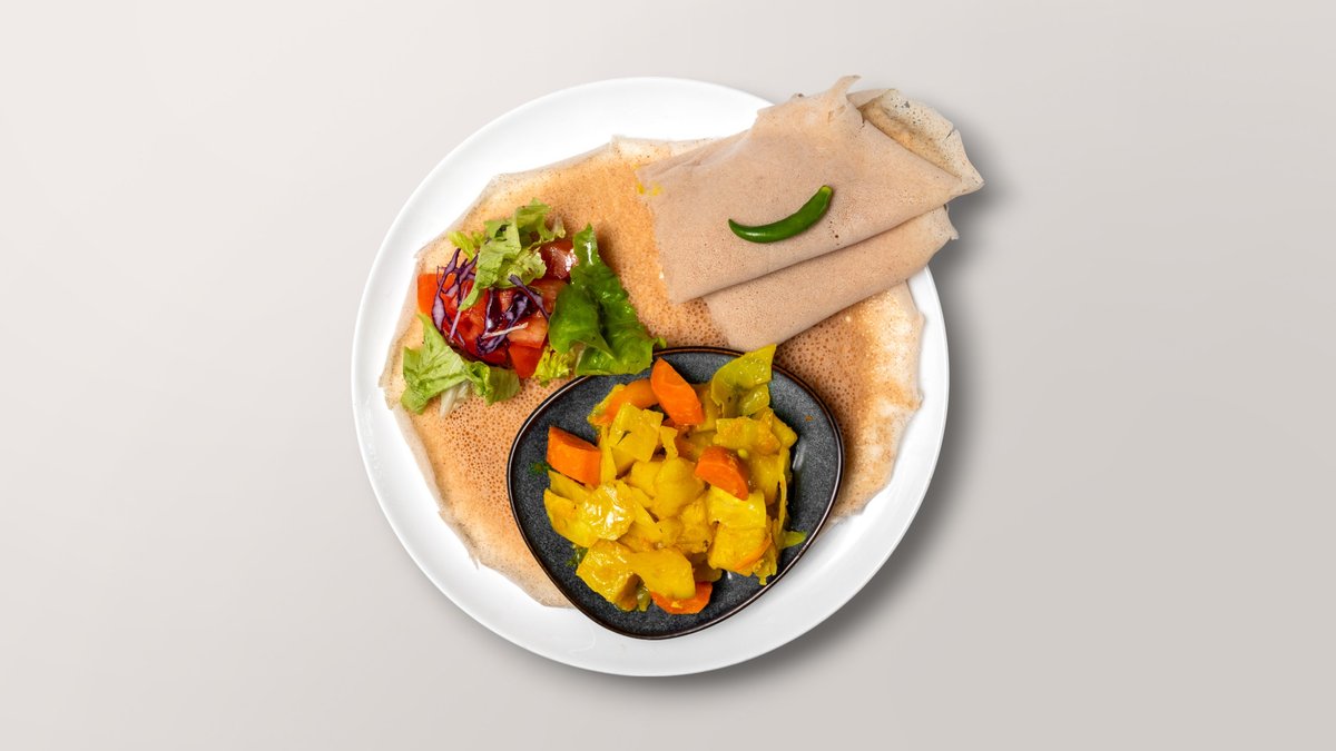 große gemischte Platte mit vielen feinen Spezialitäten aus der äthiopischen Küche, mit einer Beilage und in einer Größe deiner Wahl