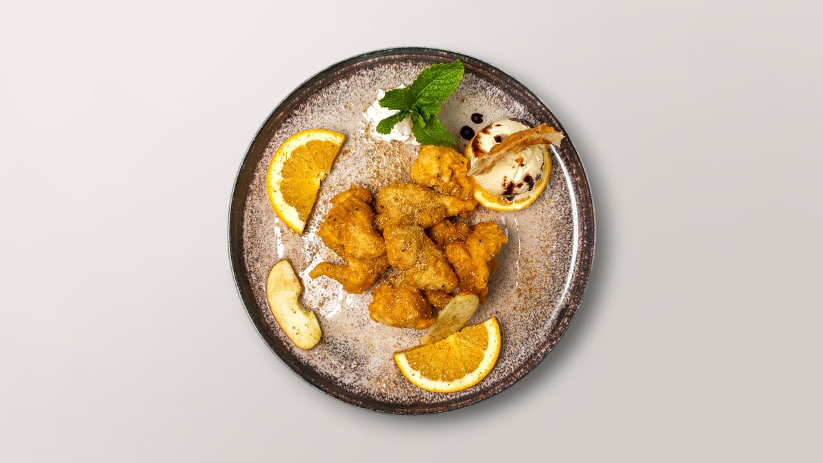 Teig mit geraspelten Orangenschalen in Honig getaucht