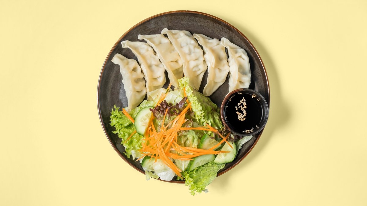 5 Stück gedämpfte Teigtaschen mit Gemüse, Soja-Yuzukosho-Mayonnaise und Sweet Chili Sauce