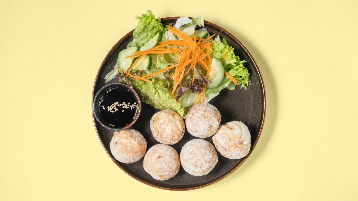5 Stück mit fritiertem Oktopus, japanischer Mayonnaise, Okonomi-Soße und Bonitoflocken