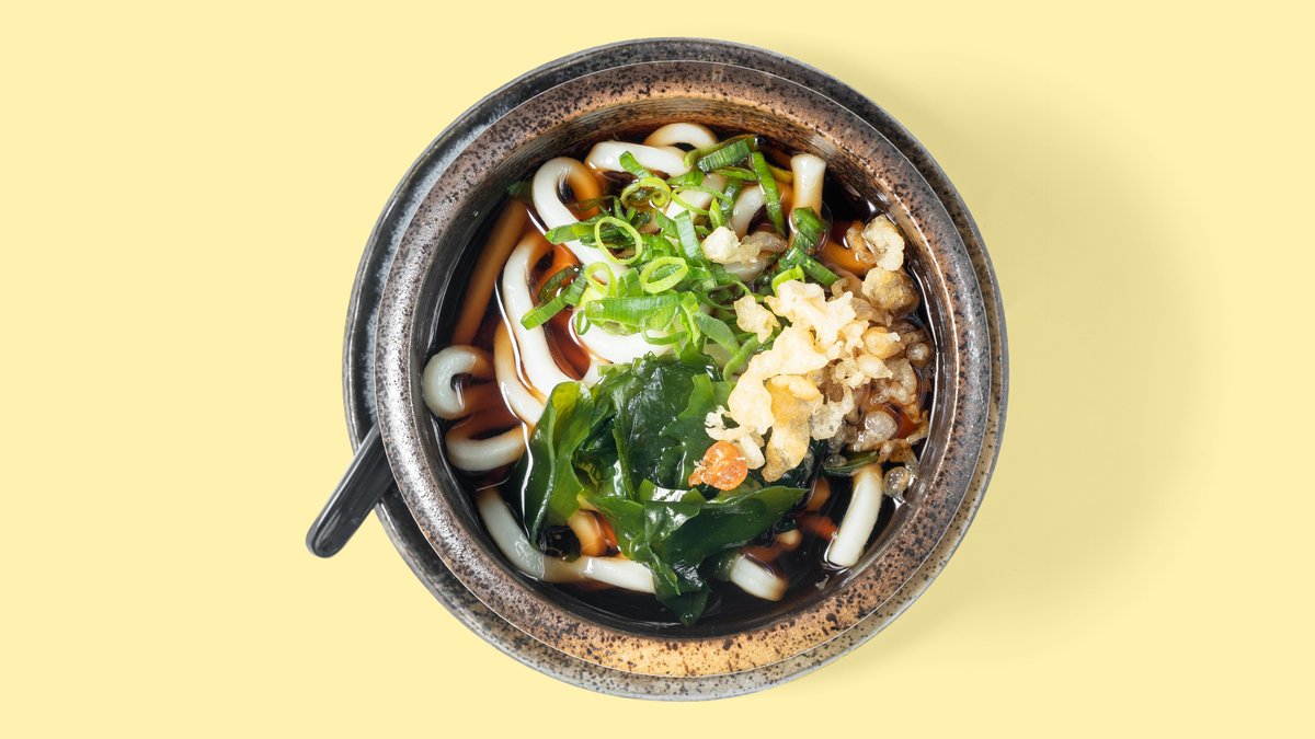 Nudelsuppe mit Garnelen- und Gemüse-Tempura, Sojasprossen, Seetang und Frühlingszwieblen