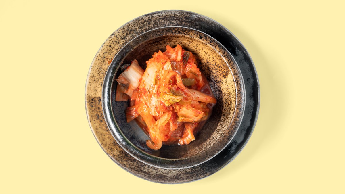 mit mariniertem Rindfleisch, Kimchi und Salat
