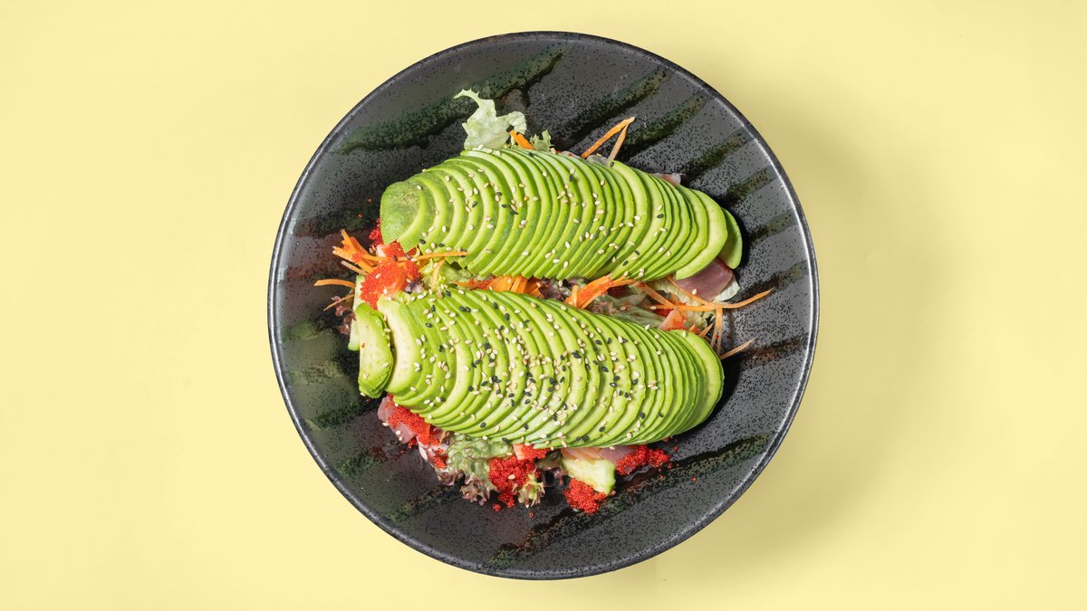 mit Gurken, Avocado, mariniertem, gekochtem Thunfisch, japanischer Mayonnaise, Zwiebeln und Sesam