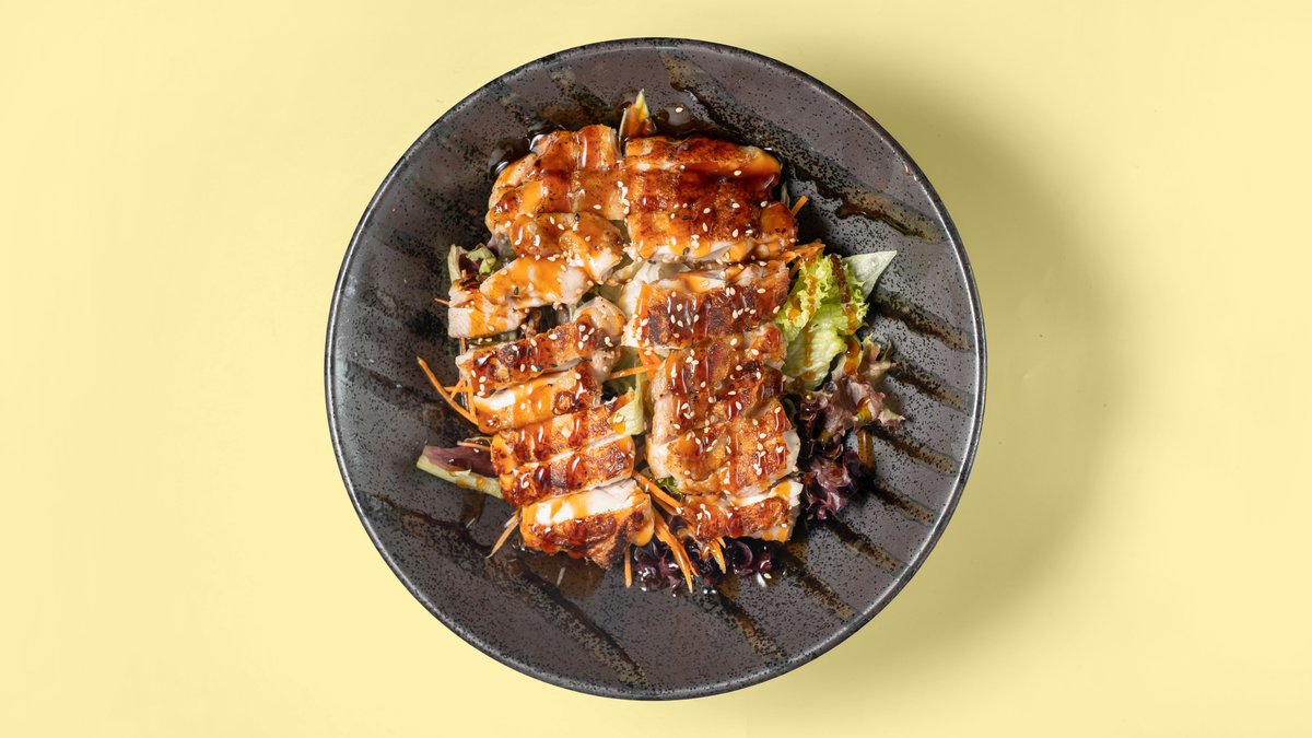 gemischter Salat mit gegrilltem Hähnchenfleisch und Teriyaki-Soße