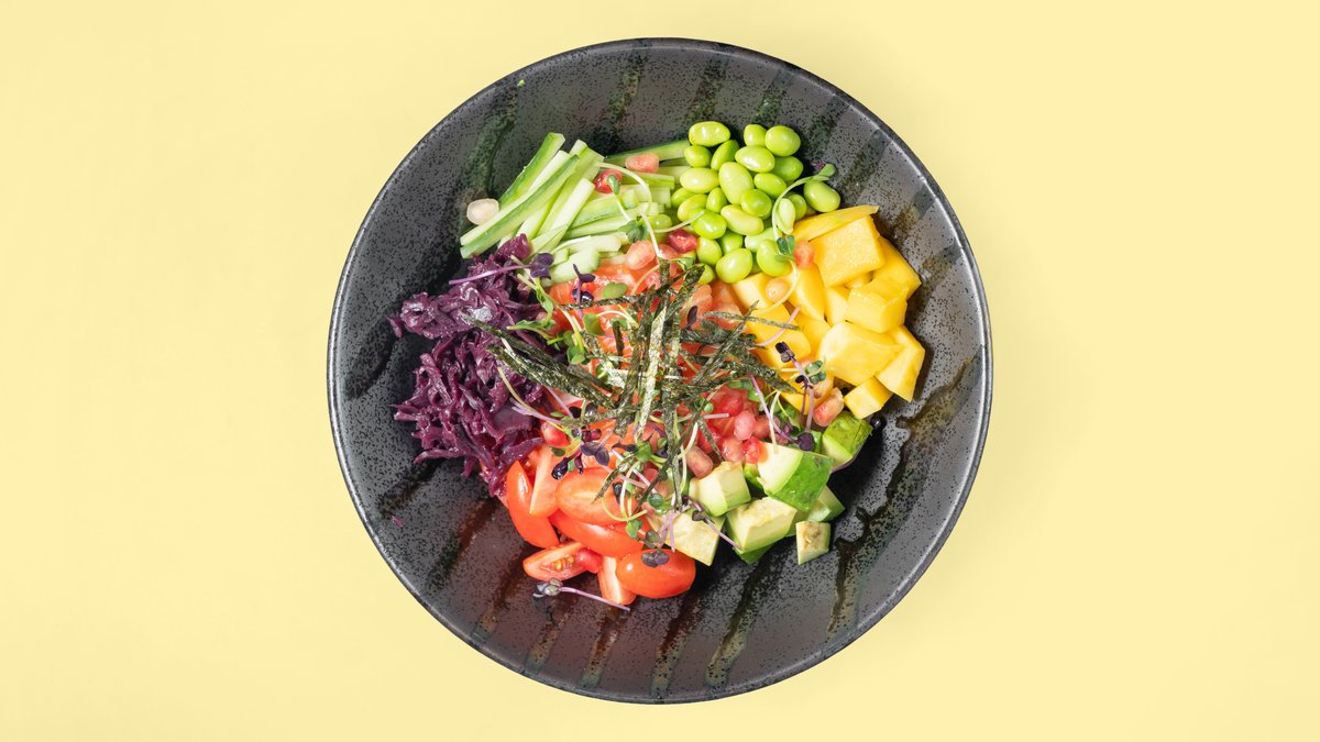 mit einer Basis, einer Hauptzutat, fünf Nebenzutaten, einer Soße und zwei Toppings deiner Wahl