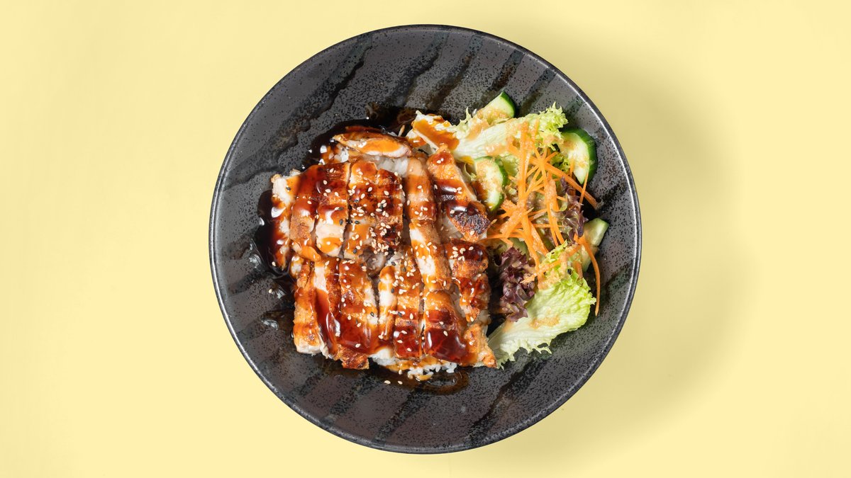 mit gegrilltem Hähnchenfleisch, Salat, Teriyaki-Soße und Sesam