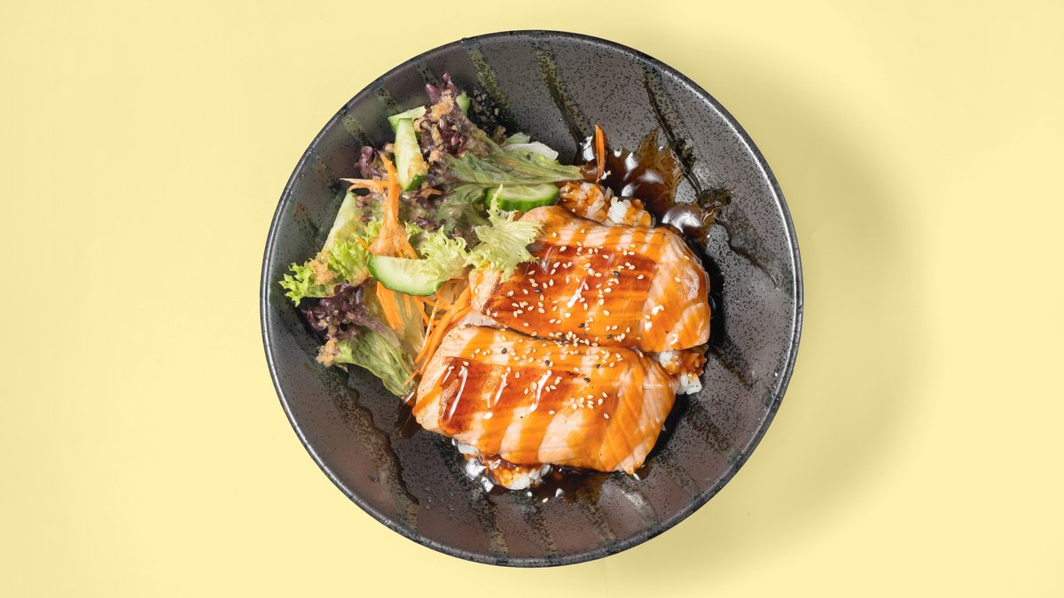 mit gegrilltem Lachs, Salat mit Teriyaki-Soße und Sesam