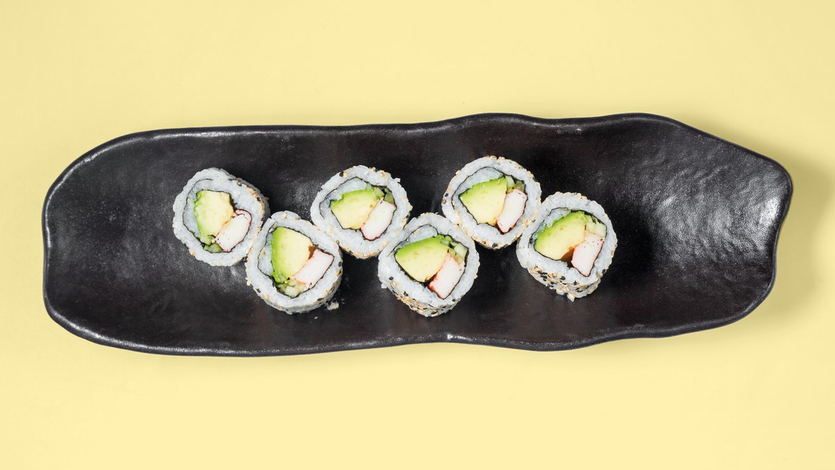 mit Surimi, japanischer Mayonnaise, Masago, Avocado und Gurken