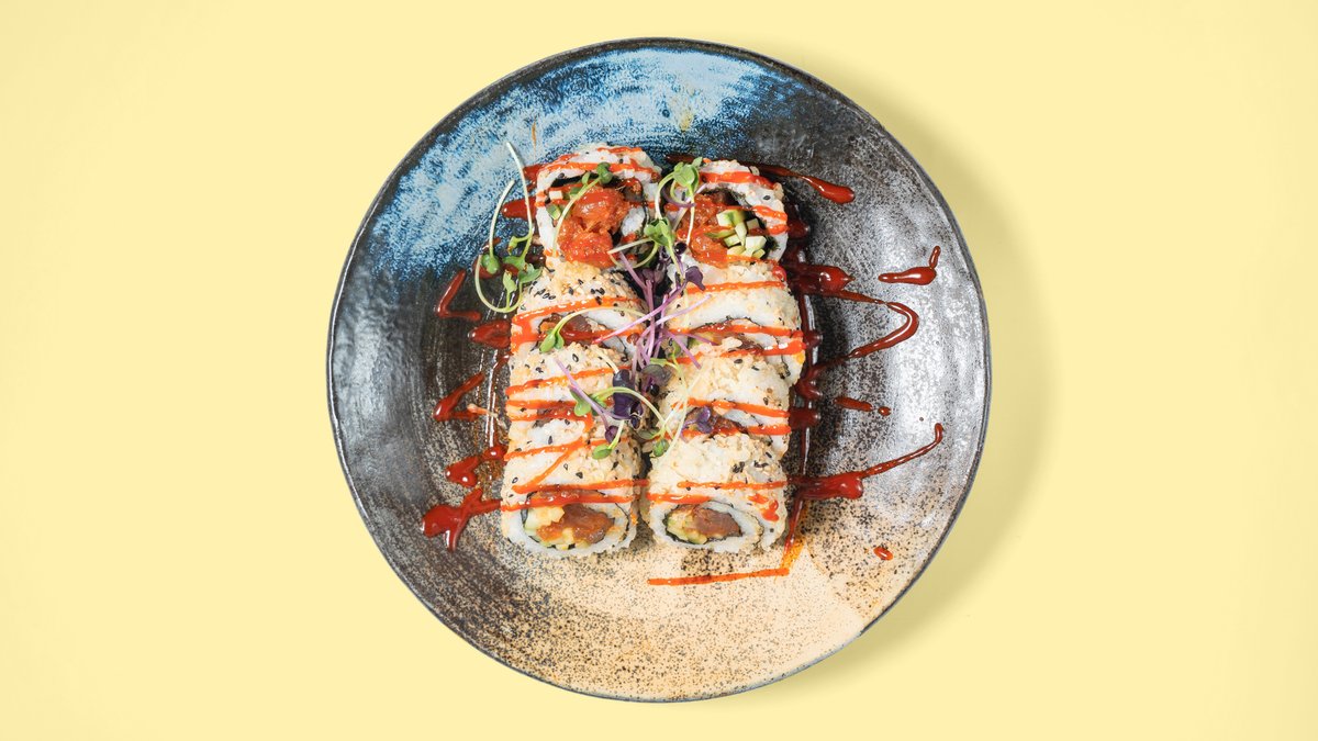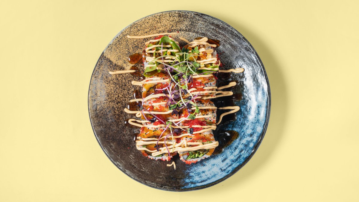 innen mit frittierten Softshell-Krabben, Avocado und Gurken, außen mit Tobiko und Kresse, dazu Teriyaki-Soße und japanische Mayonnaise