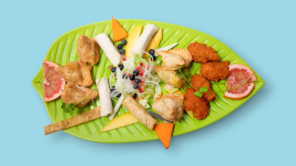 4 Personen mit Beef Samosa, Zucchini-Linsenpuffer, Veggie Samosa und Hühnerfleisch-Rollen