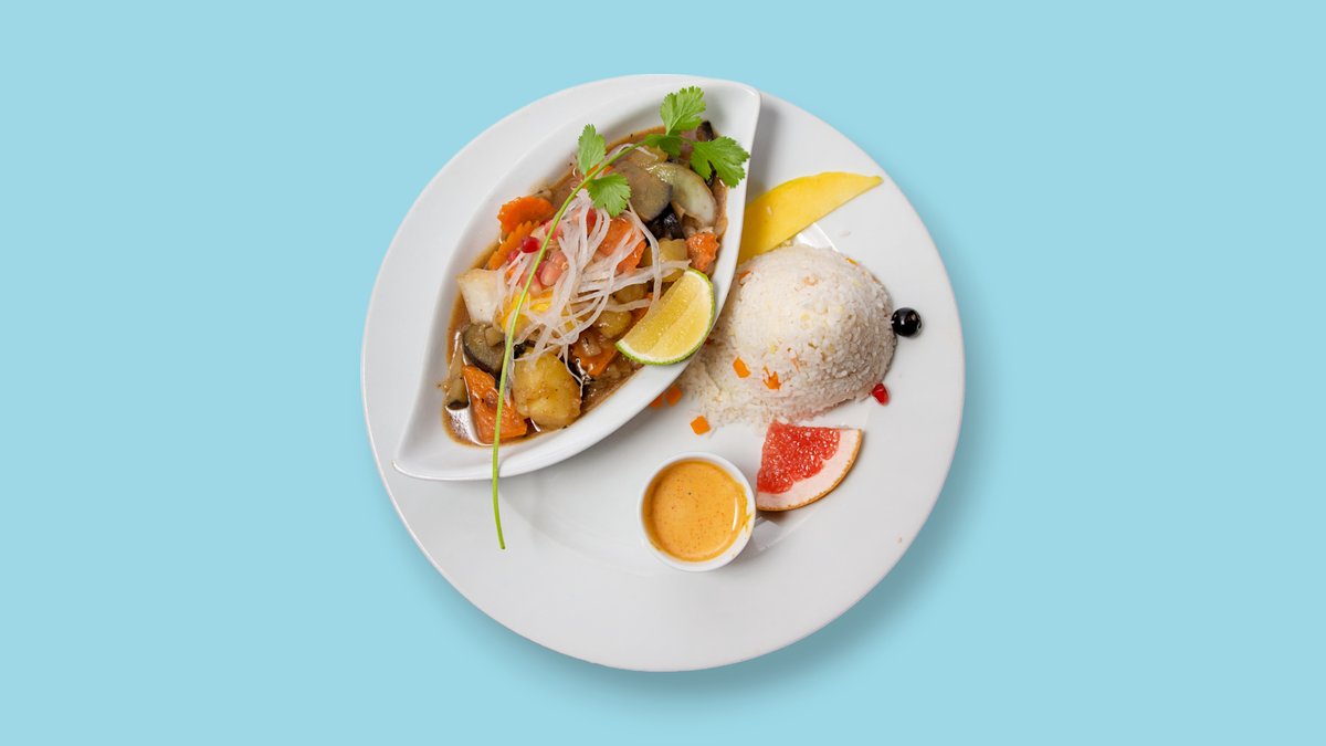 Verschiedenes Gemüse mit Kokosmilch, Fischsauce, Limettenblättern, roter, grüner und gelber Currypaste sowie einer Zutat nach Wahl