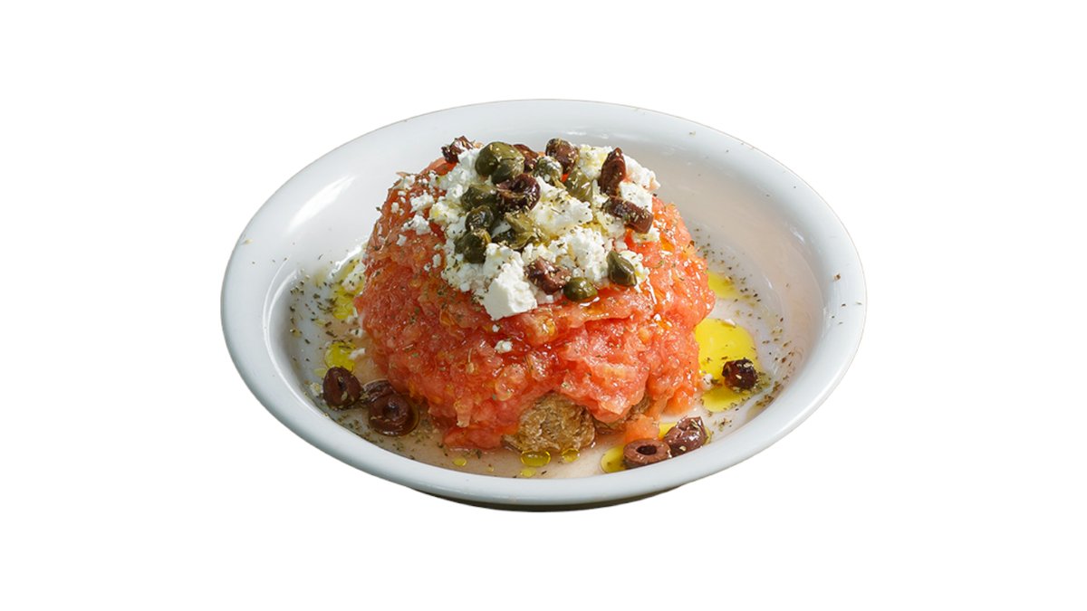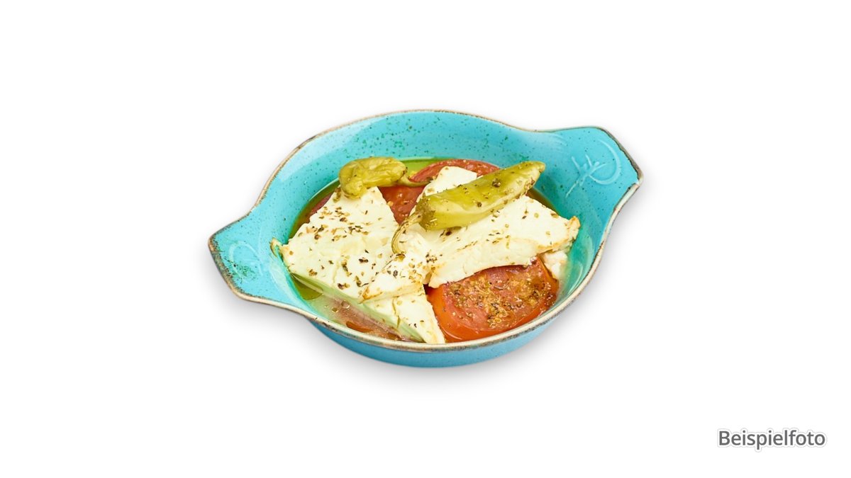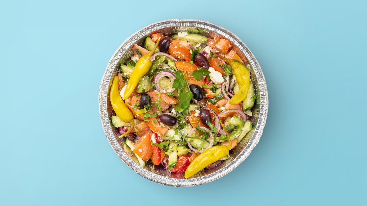 mit Tomaten, Gurken, Oliven, Peperoni, Paprika, Zwiebeln, Fetakäse und Olivenöl