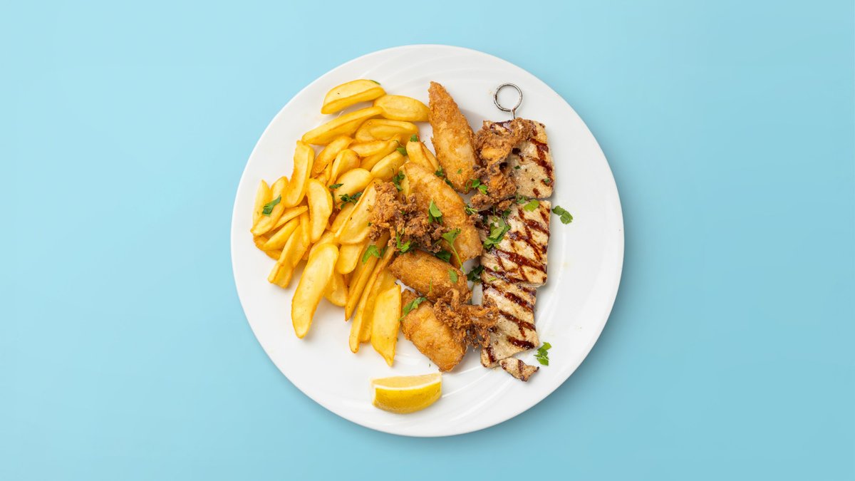 mit Souvlaki vom Schwein, Kalamari, Reis und Tsatsiki